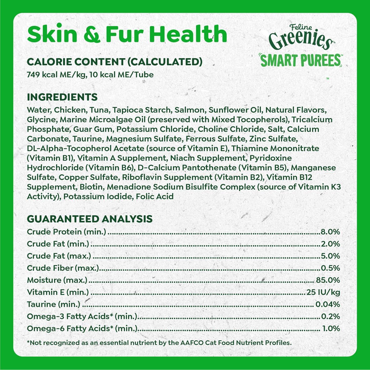 Feline Greenies Smart Purees Skin & Fur Health With Real Salmon lickable cat treats are more than a high-quality cat treat; it's a protein-packed puree cat treat with a benefit! This recipe helps nourish your cat’s skin and maintain healthy fur with omega-3 fatty acids from marine microalgae oil. These cat treat lickables are made with real salmon, a high-quality protein source to support healthy muscles. Treat with confidence knowing these cat snacks are made with natural ingredients plus vitamins, minerals, & nutrients. Nutritionally complete and balanced for adult cats, every tasty treat helps provide quality nourishment. Additionally, these lickable cat treats are rich in moisture to support daily hydration, formulated without grains, and made with highly digestible protein. Feline Greenies Smart Purees create a bonding moment when fed by hand, but you can also squeeze it into a bowl, or use as cat food toppers. The creamy texture and irresistible flavor from real salmon will delight even finicky felines. Make Health A Treat!