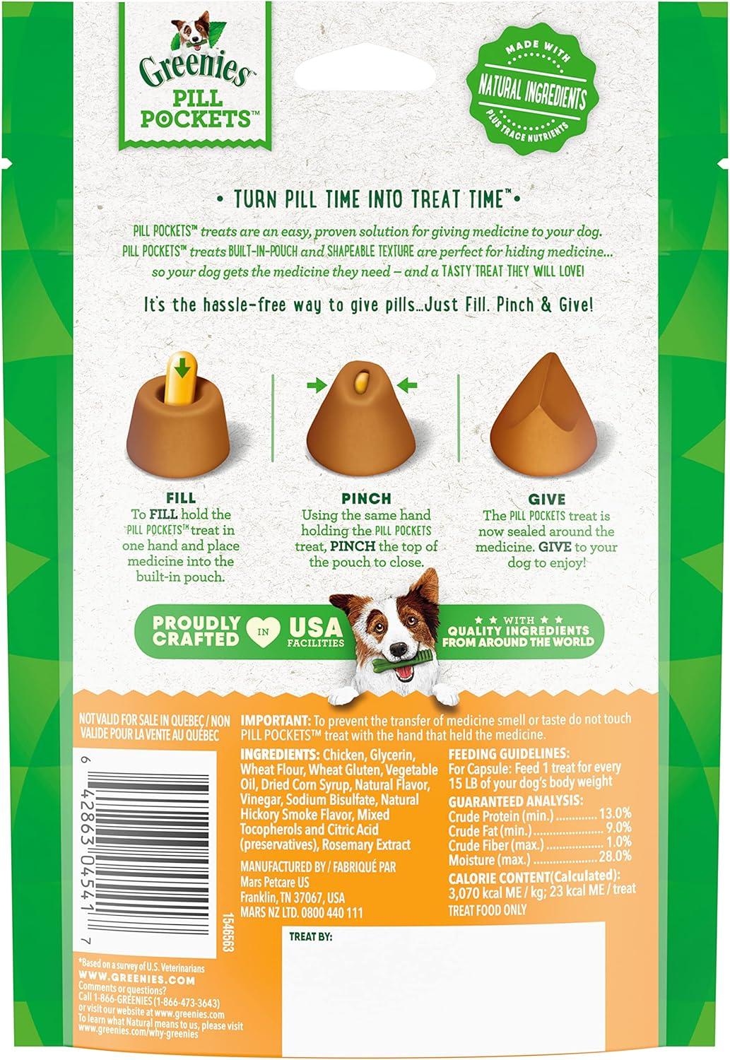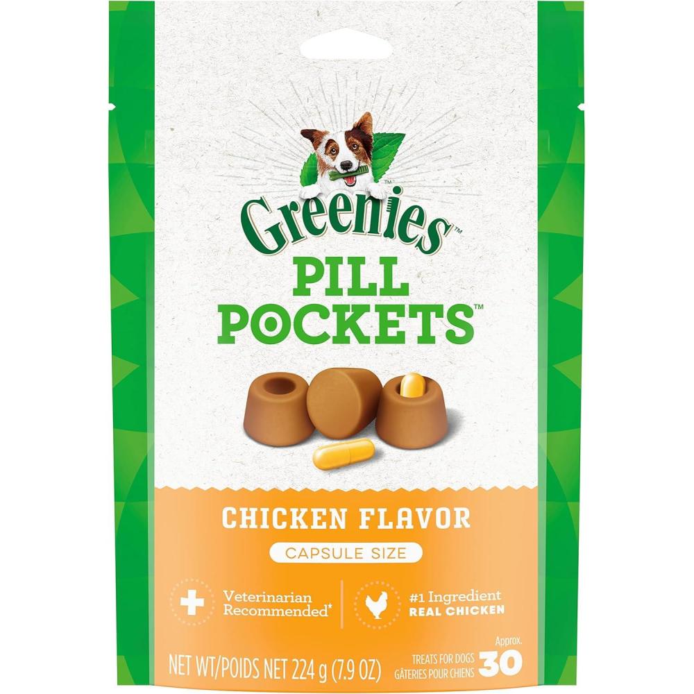 GREENIES Pill Pockets Treats for Dogs make it easy to give your dog medicine, with a tasty chicken flavor they're sure to love. Why hide your pet's medicine in human foods like peanut butter or cheese when you can give them a healthy dog treat, made with natural ingredients plus trace nutrients instead? Designed by veterinarians, GREENIES Pill Pockets Dog Treats mask the smell and taste of any medicine, taking the stress (and mess) out of giving your canine companion medicine.